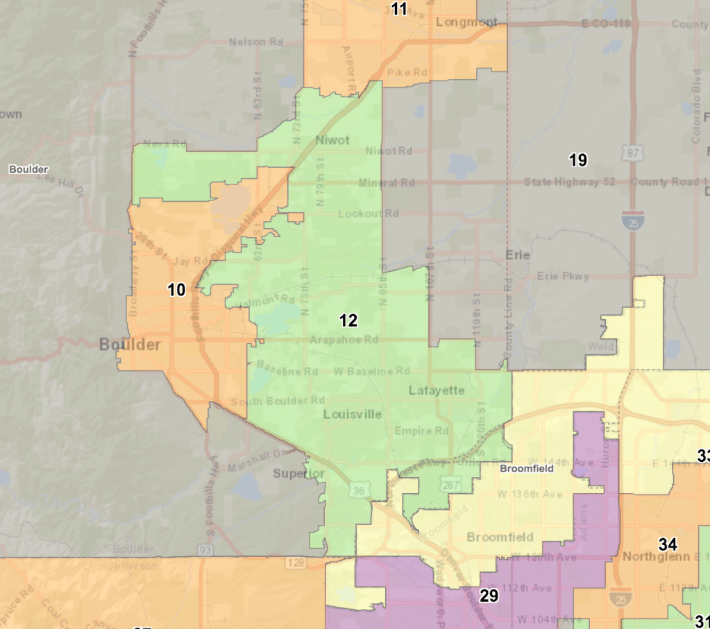 As of November 8, 2022, Colorado’s House Districts changed through redistricting. Here is the new map for House District 12 which encompasses parts of Louisville, Lafayette, Superior, and Niwot.